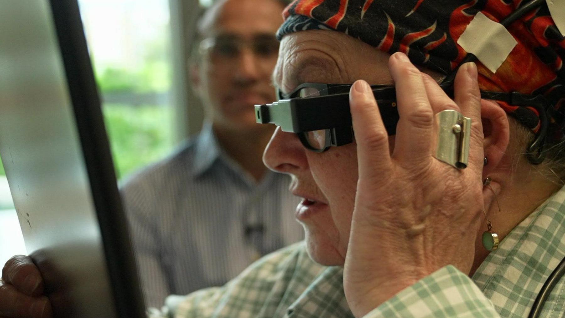 Одна из пациенток, Шейла Ирвин (Sheila Irvine) из Уилтшира (Wiltshire), в Юго-Западной Англии, которая обрела способность читать после операции по установке микрочипа Prima под центр сетчатки глаза. Пациетам выдавали очки дополненной реальности с видеокамерой, подключенной к небольшому компьютеру, которые крепились к поясу. Очки включали функцию масштабирования, увеличивающую текст и облегчающую его чтение. Далее эти очки использовались для фокусировки и сканирования объекта на проецируемом изображении, который пациенты хотели прочитать. Очки проецировали изображение в виде инфракрасного луча на вышеупомянутый микрочип-имплант под центром сетчатки глаза, этот микрочип и активировал устройство. Искусственный интеллект в компьютере, закрепленном на поясе, обрабатывал информацию и преобразовал её в электрический сигнал, который проходил через клетки сетчатки и зрительного нерва в мозг. Таким образом пациенты обретали зрение, как в данном случае Шейла Ирвин. Фотография Британской вещательной корпорации BBC.